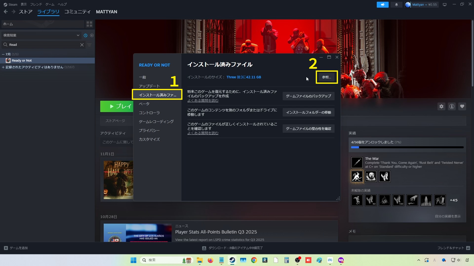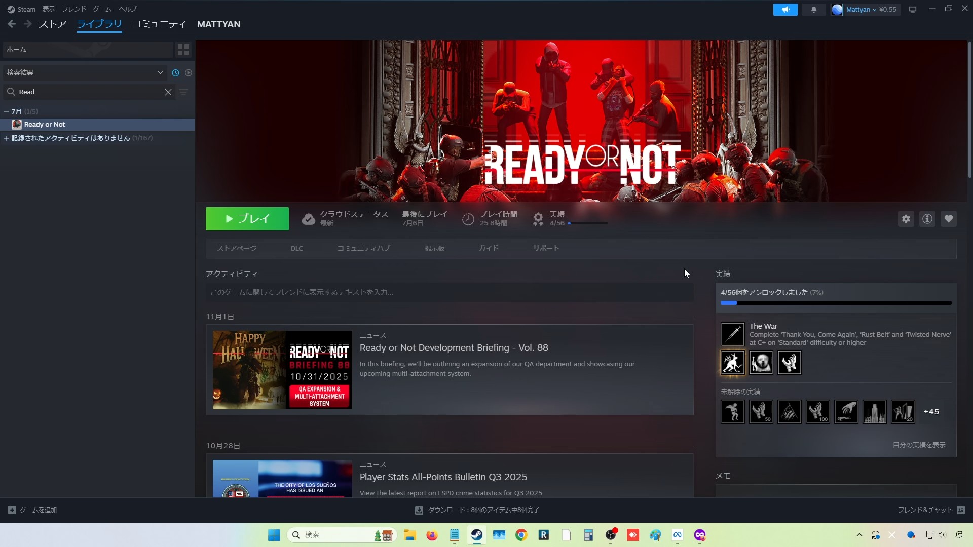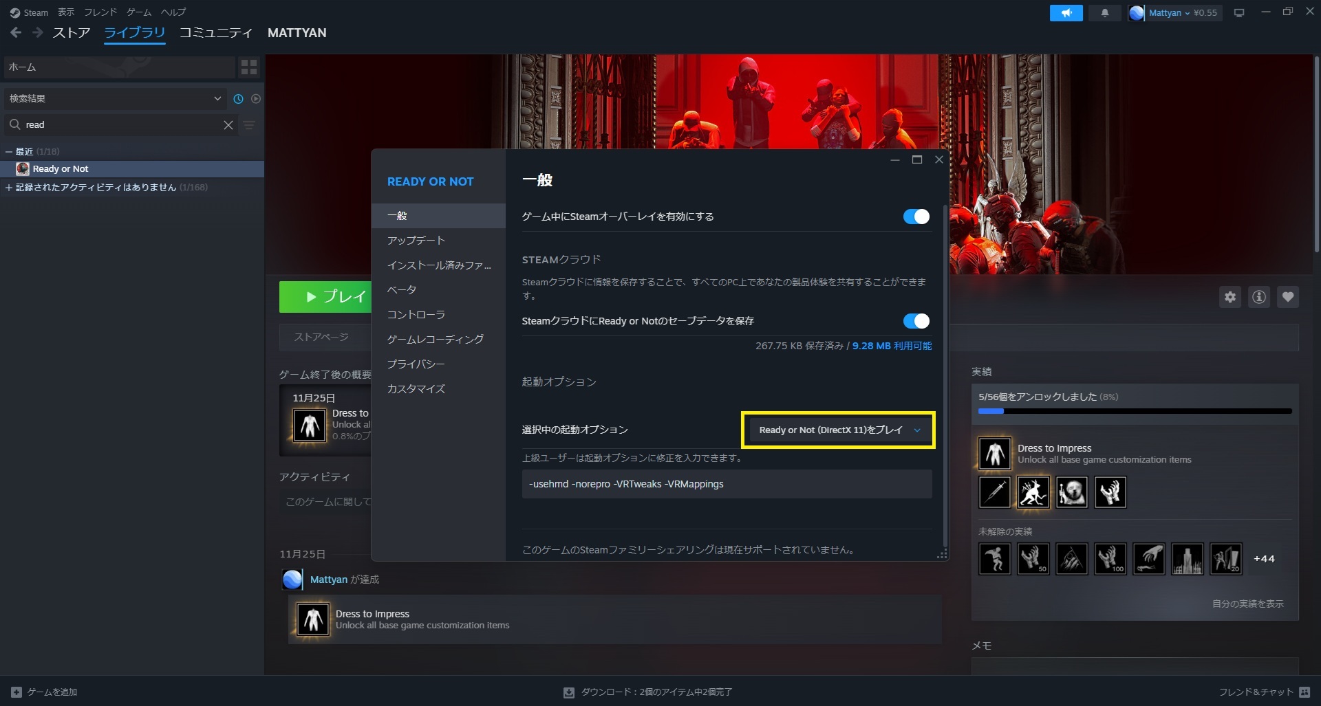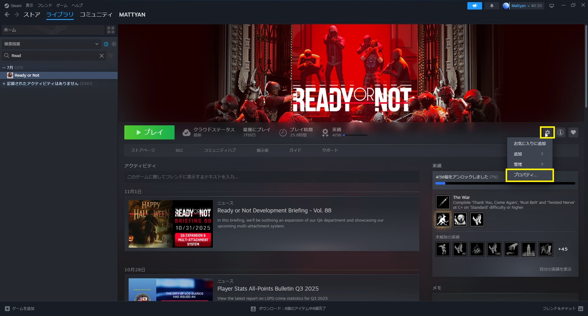 ファイルの展開ができたら、Steamのライブラリを開き、Ready or Notのページを開いてください。