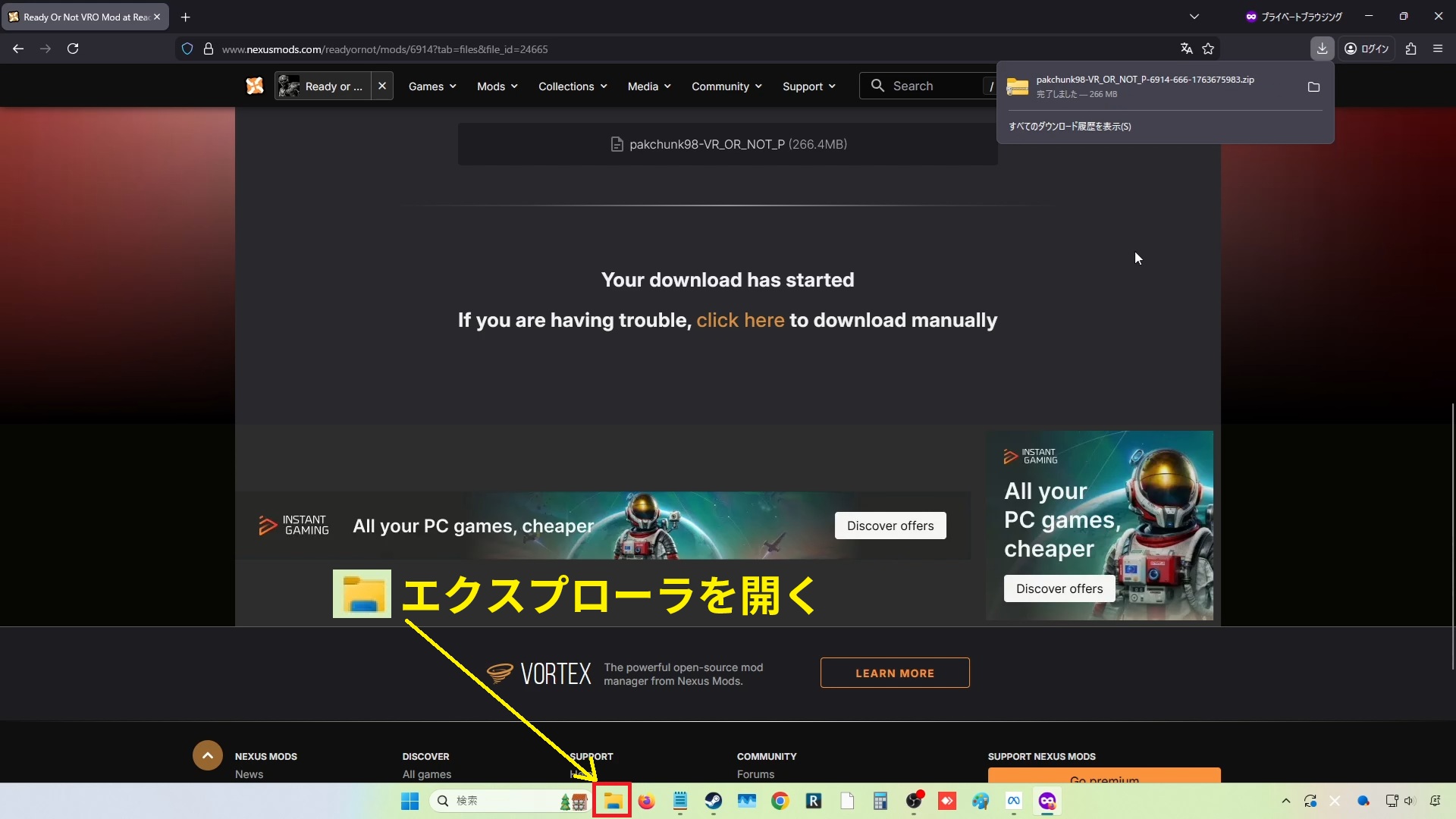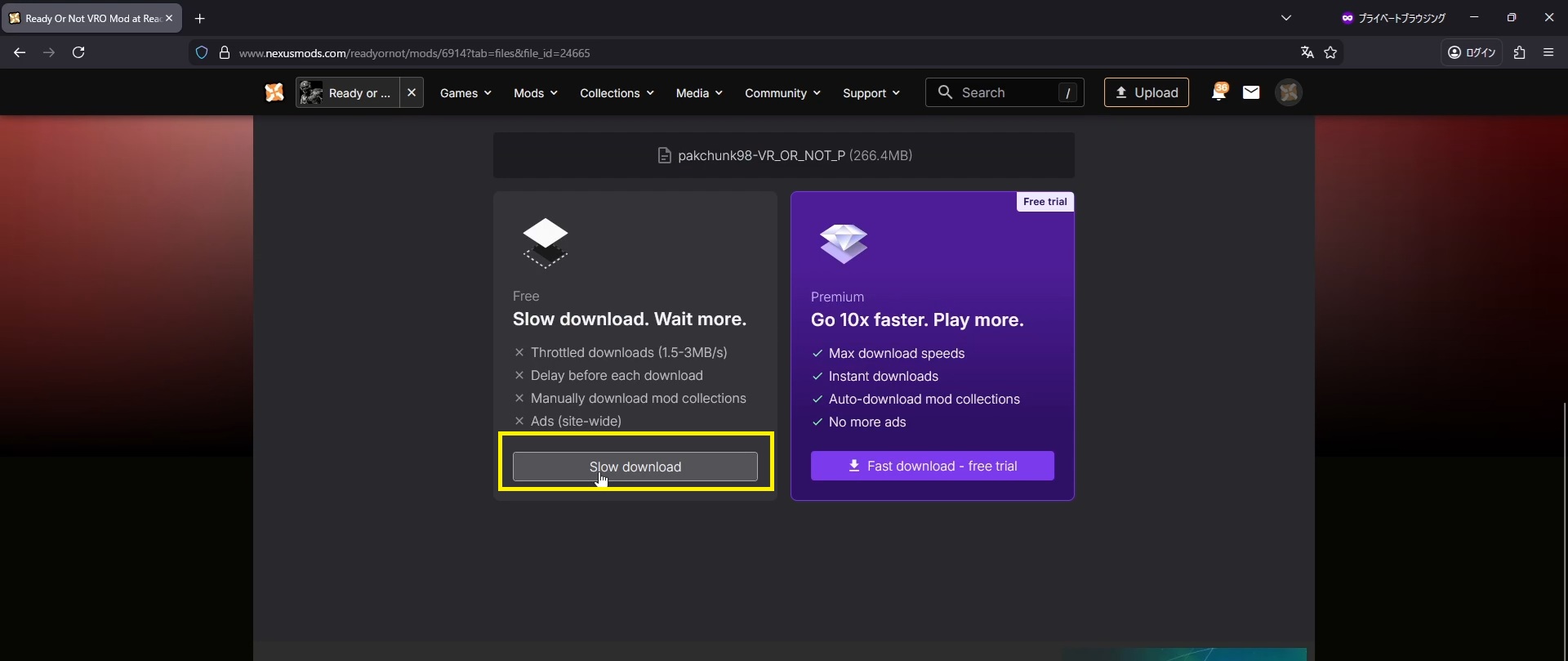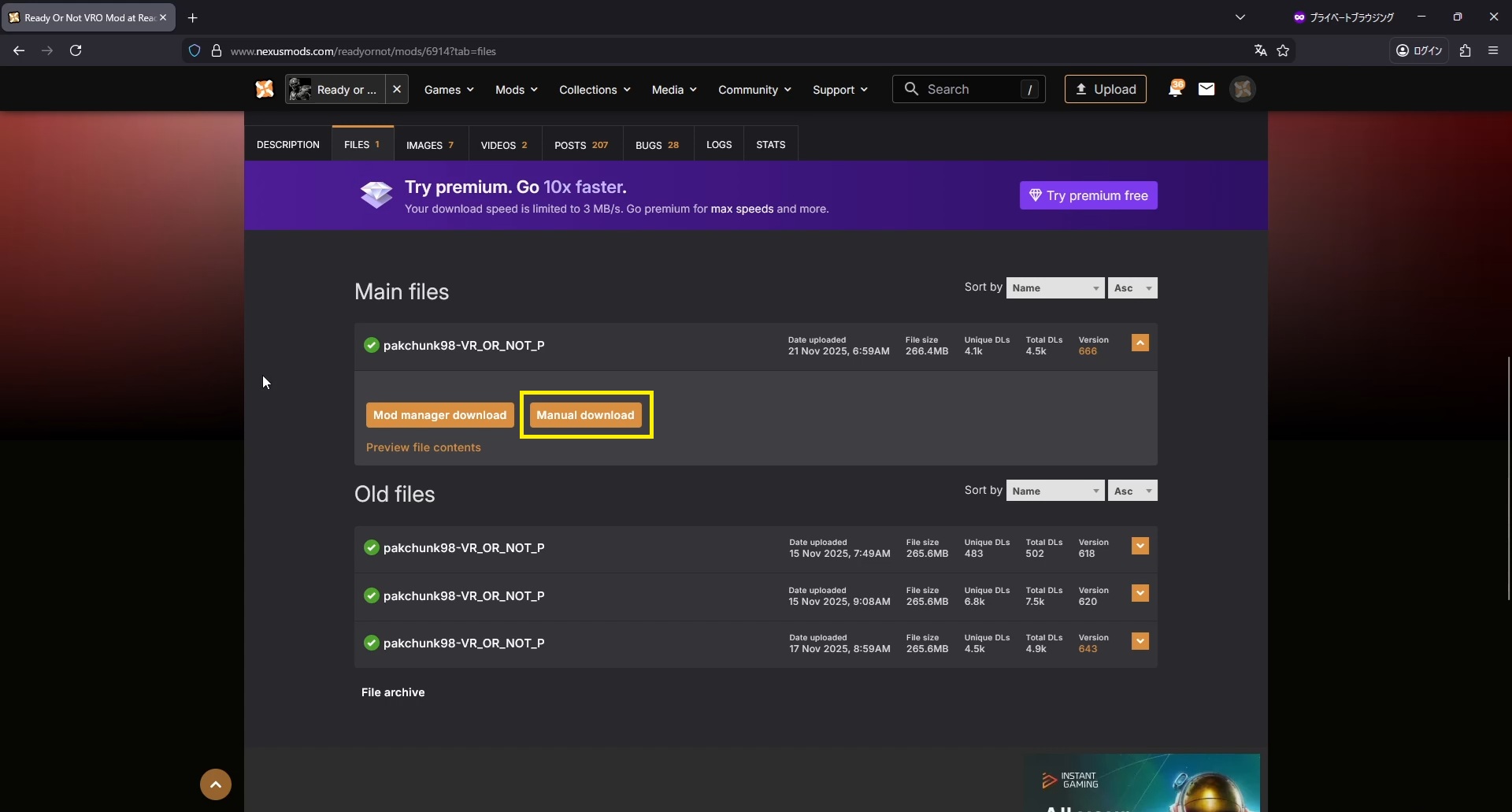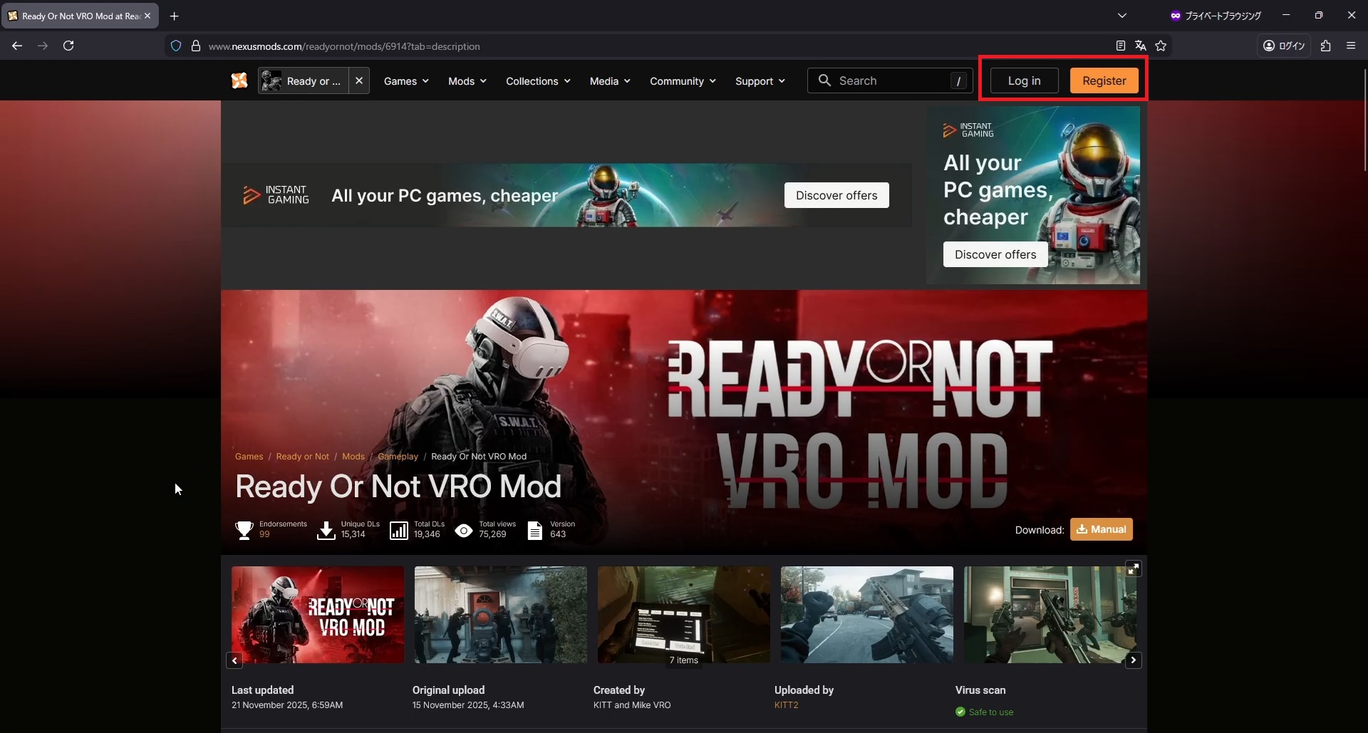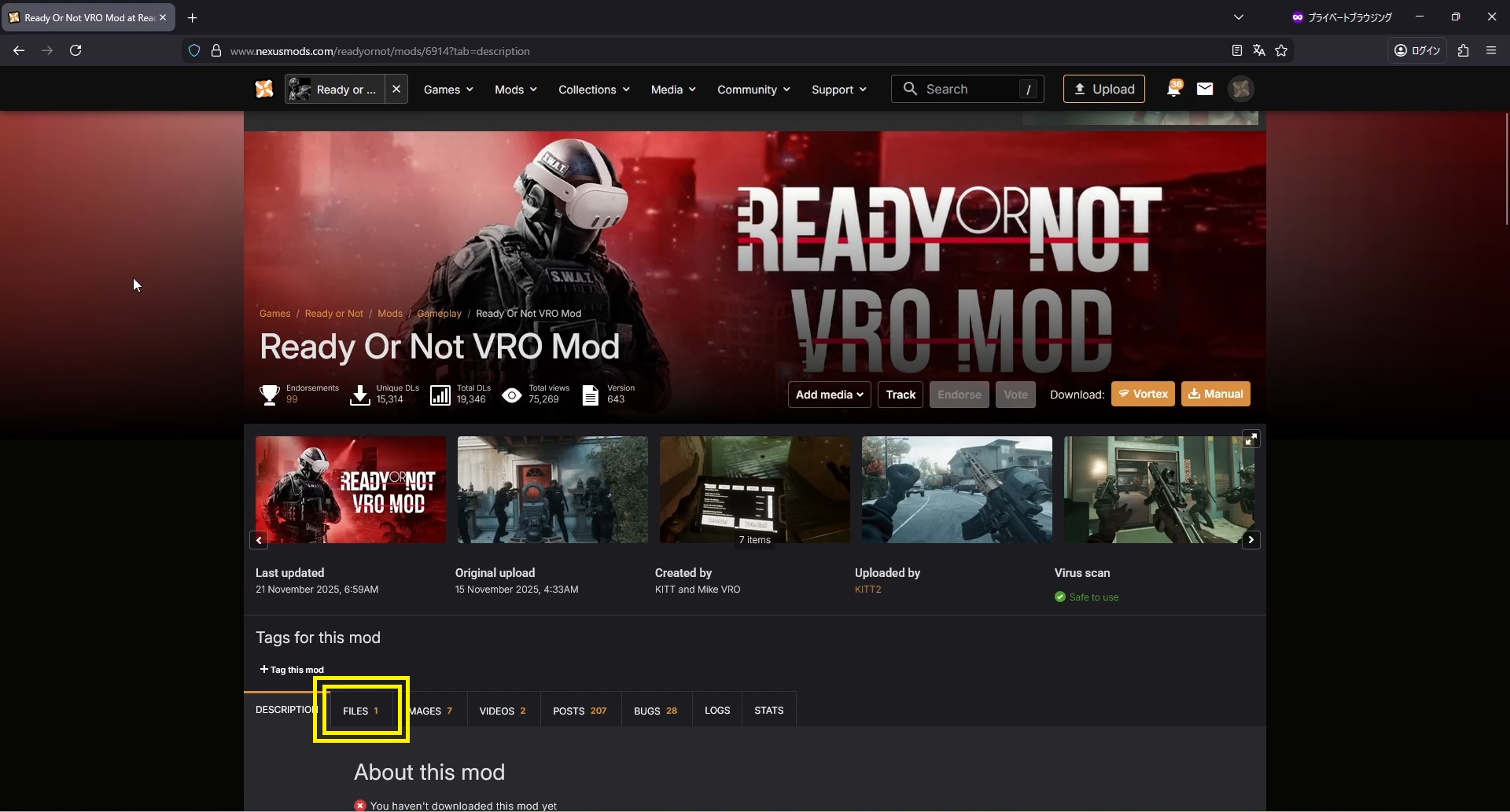 そうしたら、Ready Or Not VRO MODの配布ページに移動してください。Nexus ModsというMOD配布サイトのページに飛びます。