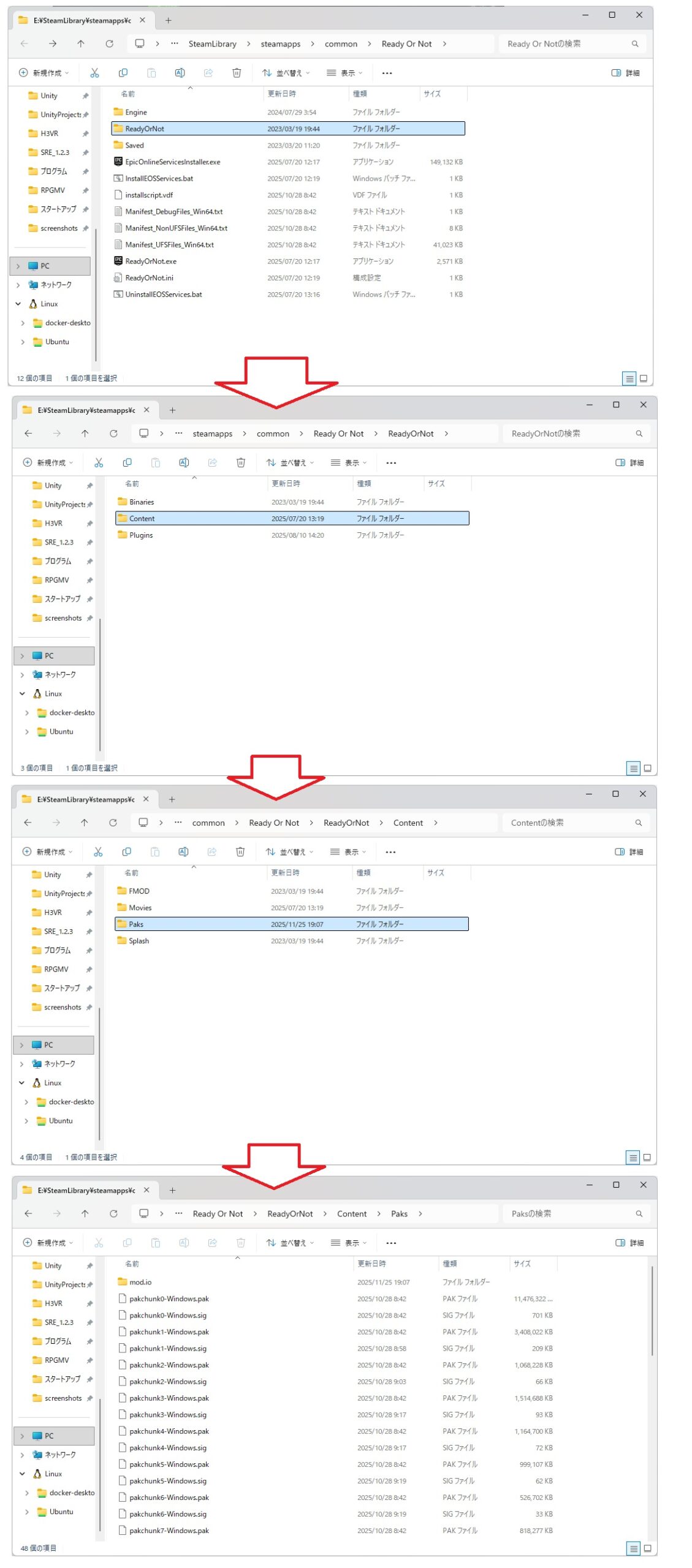 中にある「ReadyOrNot」フォルダを開き、その中の「Content」フォルダを開き、最後にその中の「Paks」フォルダを開いてください。