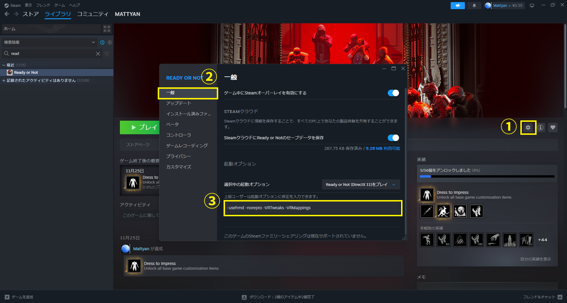 そうしたら、SteamでReady or Notのプロパティを開き、一般タブに移動します。