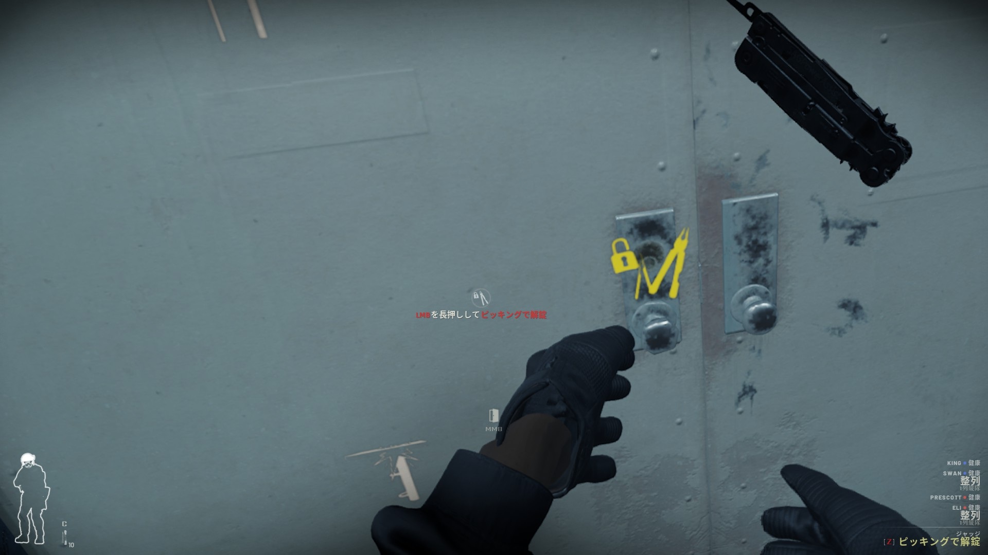 なお、ロックピックを取り出すには左手でドアノブを指さして左手Xボタンを押すか、後ろ腰のアクセサリポーチから取り出してください。使うには右手のトリガーです。