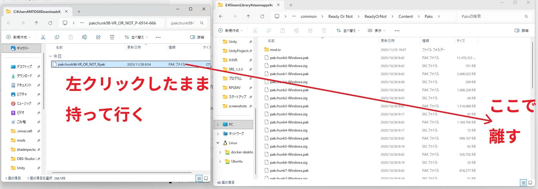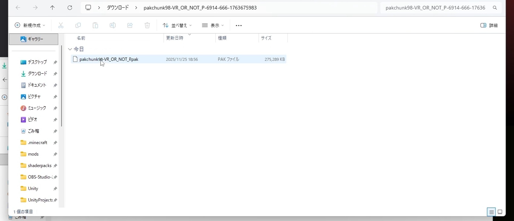 今開いた「Paks」フォルダの中に、先程ダウンロードした「pakchunk98-VR_OR_NOT_P.pak」を移動してください。これで、ゲームへのMODインストールは完了です。続いて事前準備に入ります。