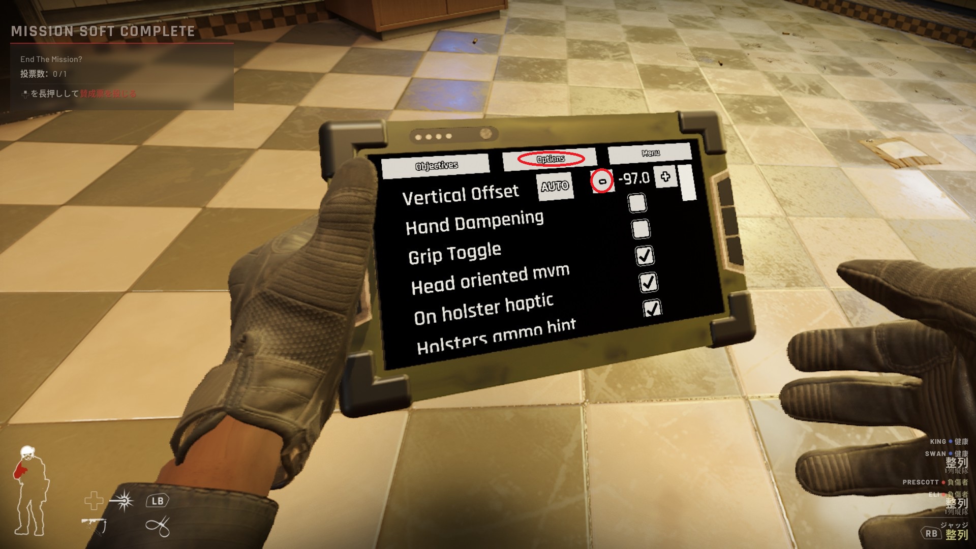 基本的には左手Xボタンを押していればなんとかなります。扉の開閉や民間人の逮捕もXボタンです。なお、インタラクトが可能な状態で左スティックを押し込むと味方にその動作を命令することができます。