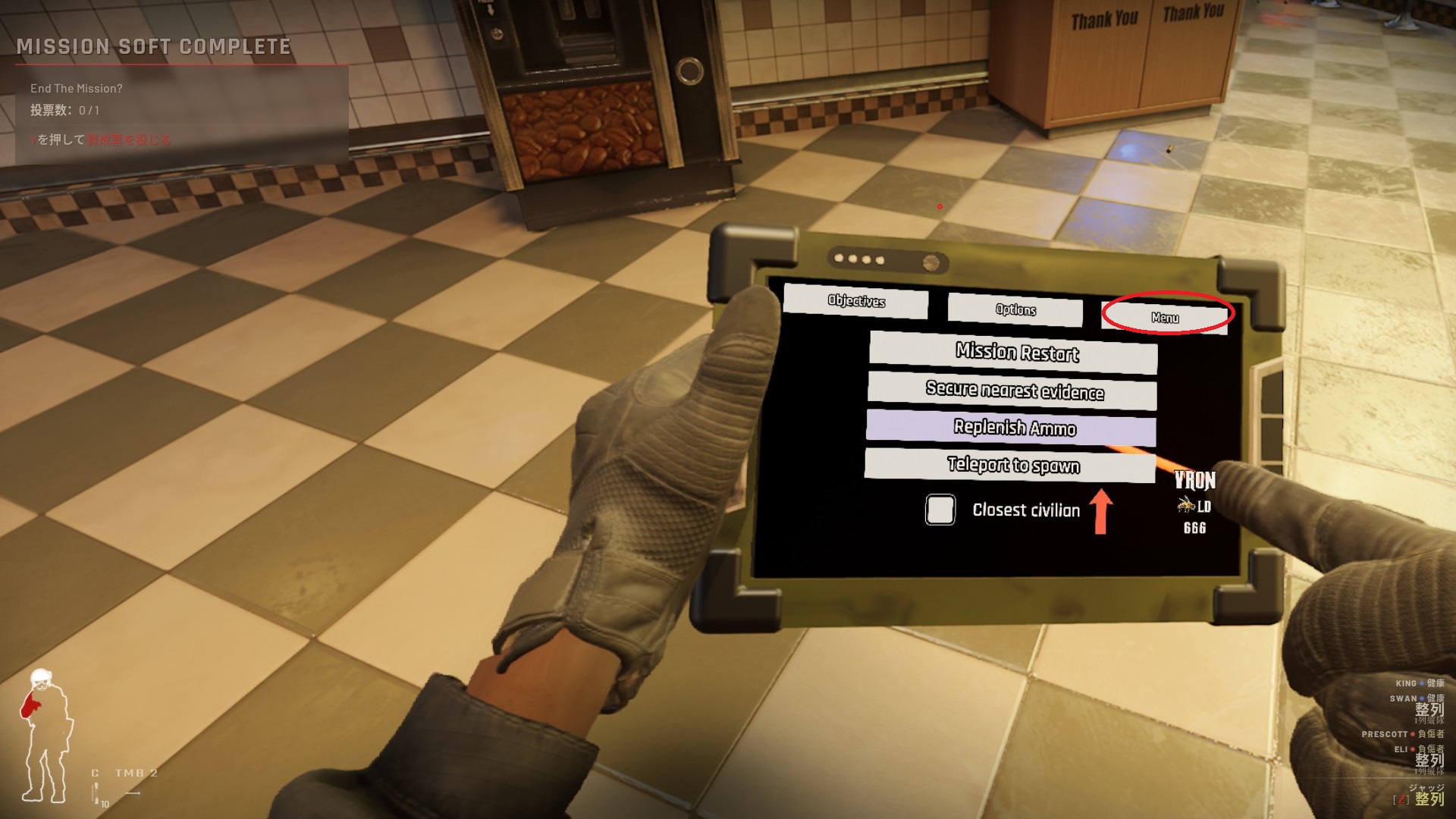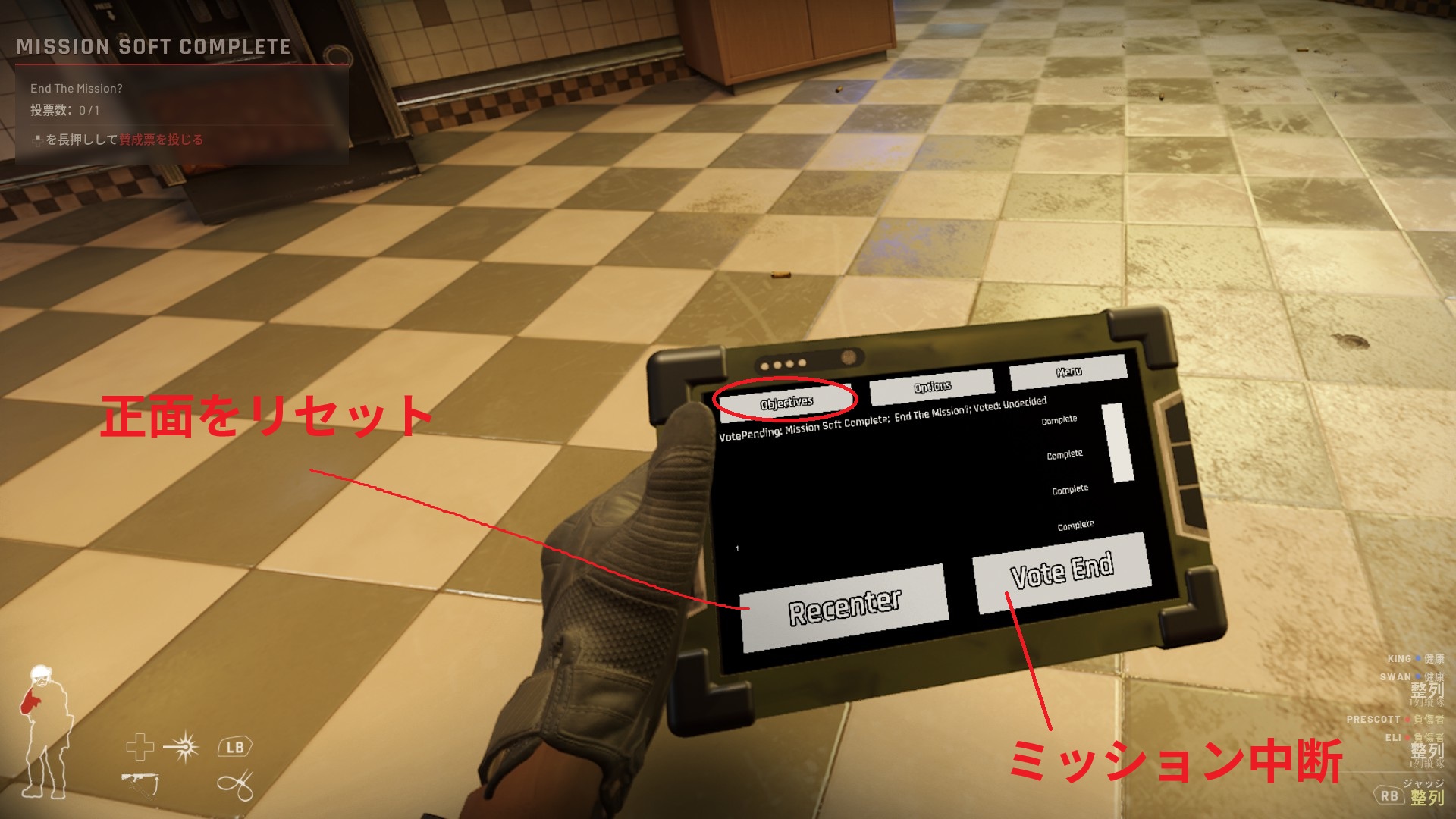 左下の「Recenter」を押すと正面を今向いている方向に直すことができます。右下の「Vote End」を押すとミッションを中断できます。すべてのミッションを終わらせてもゲームは自動終了しないので、大体終わったようであればこのボタンからミッションを終わらせましょう。