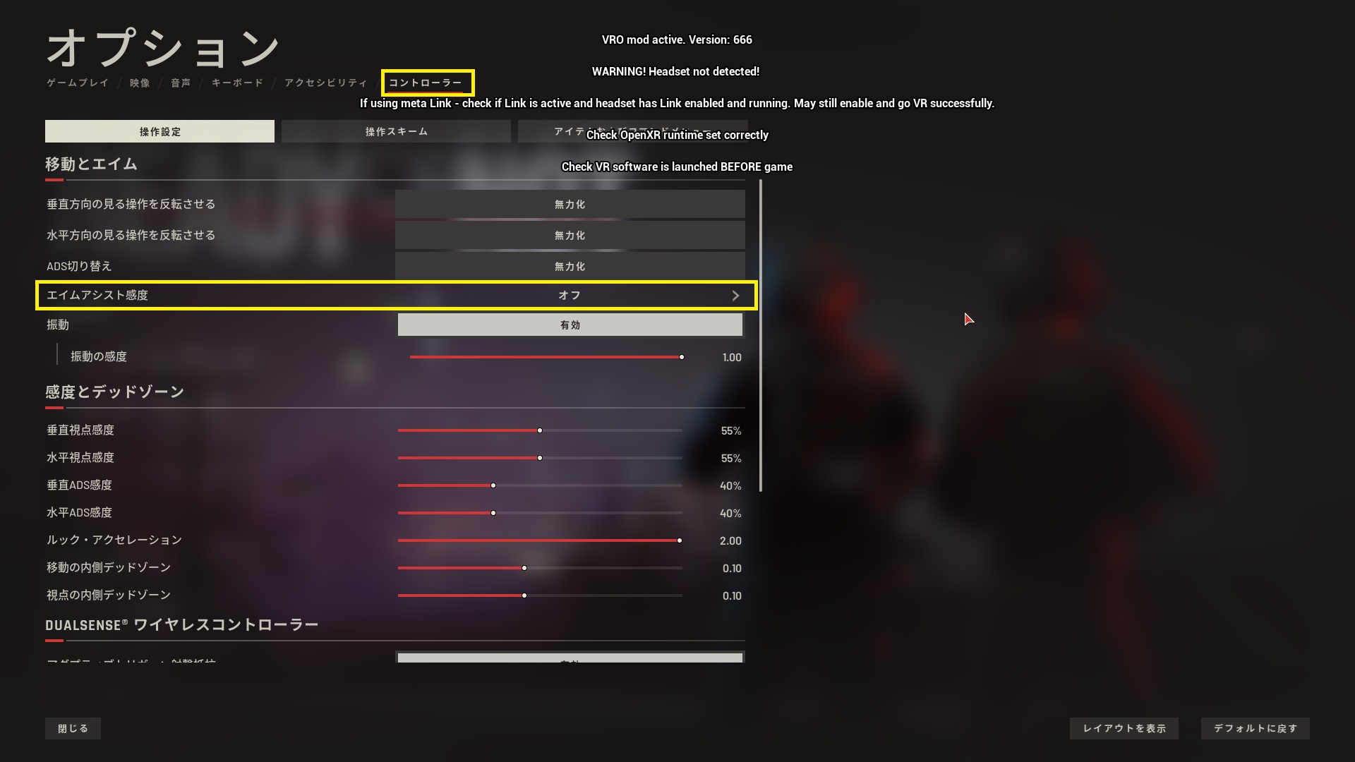 続いて「コントローラー」タブに移動し、エイムアシスト感度を「オフ」に設定してください。ここでは適用ボタンを押す必要はなく自動で保存されます。画質の設定とエイムアシストの設定が終わったら、ゲームを閉じてください。