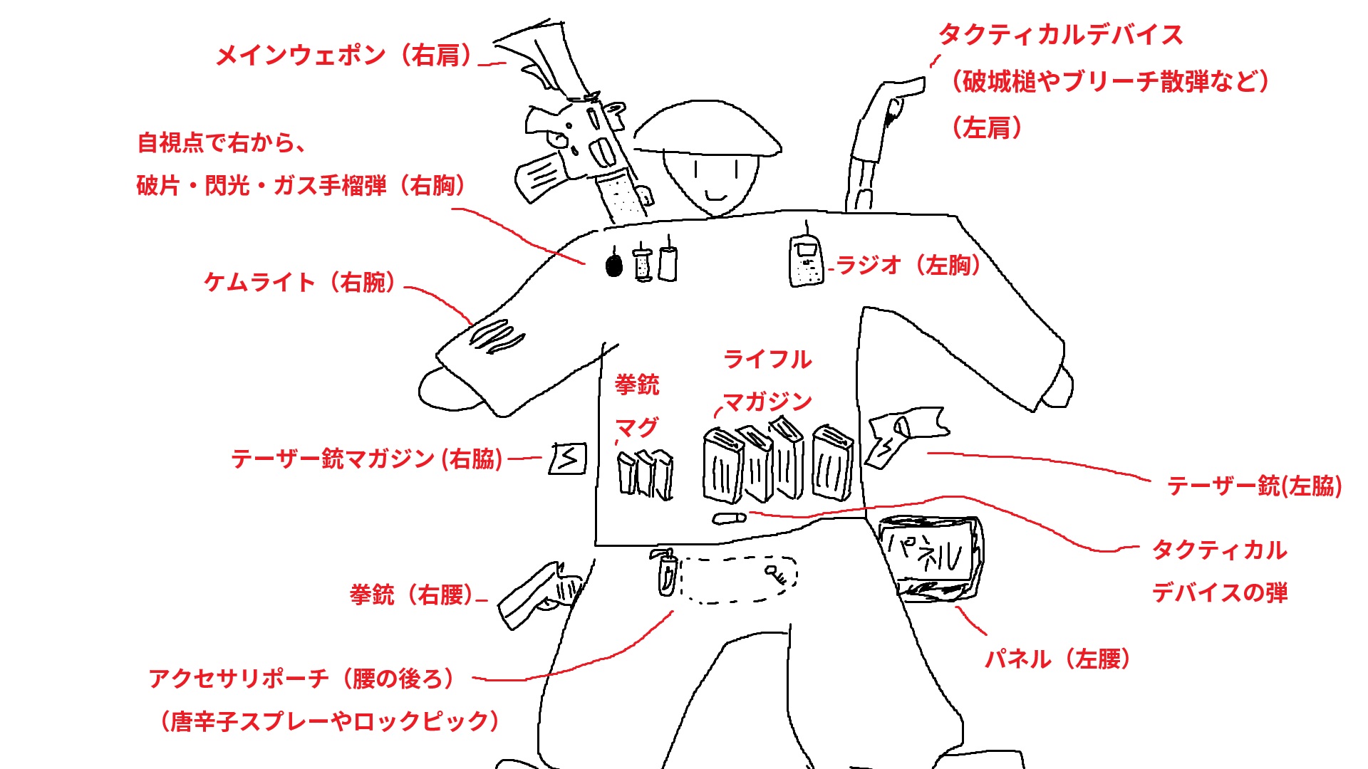 銃について、初弾装填後にコッキングが基本不要ということと、銃に刺さっているマガジンを抜くときはトリガーで、ポーチからマガジンを出すときはグリップ、ということだけ注意が必要です。