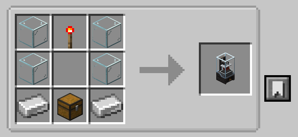 TaCZ アタッチメント作成テーブル:スコープやストックなどのアタッチメントを作成します。レシピは「ガラス4、レッドストーントーチ1、鉄インゴット2、チェスト1」です。