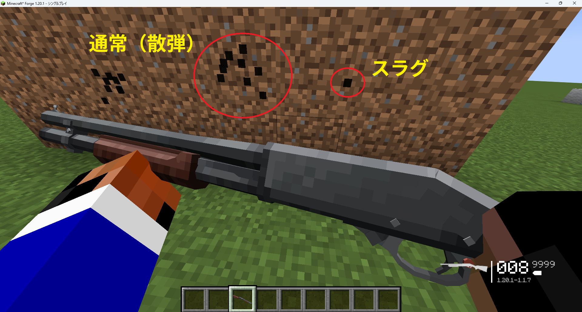通常ショットガンは多数の小さな弾を発射しますが、スラグでは単一の大きな弾を発射します(Minecraftなので弾丸の大きさは同じに見えますが…)