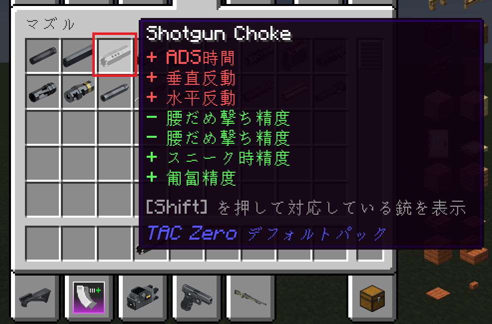 (JEIというMODでMODで追加されたアイテムのレシピが確認できます。TaCZでは複雑なクラフトは要求されませんが、進化版のEMIもオススメです↓)